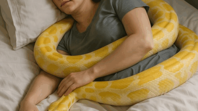 Ces mots la frappèrent comme de la glace. Ce soir-là, la femme s’assit au bord de son lit et regarda Safran glisser lentement sur le drap. À un moment, le serpent était allongé exactement comme sur la photo : enroulé en cercle autour d’une femme endormie – sauf que cette fois, la femme ne dormait pas.