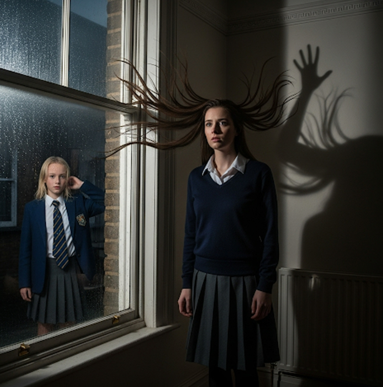 Elle était plus grande qu’elle. Plus mince. Avec de longs bras déchiquetés et une tête qui tressautait comme une marionnette brisée. Et lorsqu’elle est entrée dans le couloir, l’ombre n’est pas restée derrière elle, elle s’est déplacée à côté d’elle. Puis devant elle.