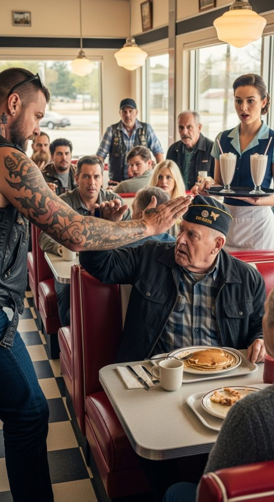 La réponse, prononcée avec un calme imperturbable, ne fit qu’attiser l’arrogance du motard. Soudain, la main de Cole traversa la table et frappa violemment Harold à la joue. Le bruit de la gifle résonna dans tout le restaurant. La casquette d’Harold tomba par terre et son café se répandit sur la table. Une serveuse haleta et porta la main à sa bouche, une mère protégea les yeux de son enfant, et la famille assise au box se tut. Cole rit doucement, fier de sa démonstration. « Tu aurais dû rester dans le passé, soldat », railla-t-il.