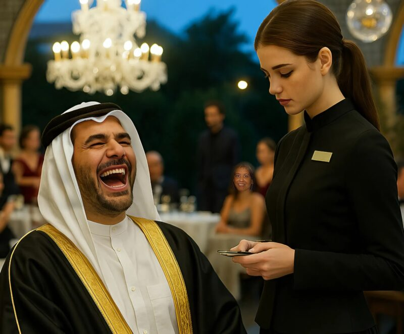 Le dîner terminé, le cheikh laissa un généreux pourboire sur la table. Mais il ne s’arrêta pas là : il se leva, fit le tour de la table et s’adressa personnellement à la serveuse.