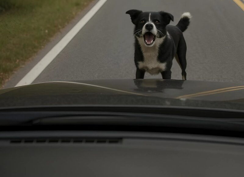 Juste devant moi, comme sorti de nulle part, un chien a surgi sur la route. J’ai freiné brusquement, les pneus ont crissé et la voiture s’est arrêtée à quelques centimètres de lui. Il a failli être percuté.