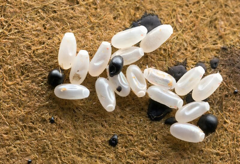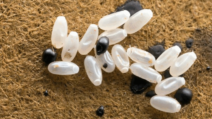 Ce que j’ai appris : les œufs de punaises de lit sont petits, environ 1 mm, blancs, ovales, brillants et ressemblent à des grains de riz. La femelle les pond dans des endroits cachés : dans les coutures du matelas, derrière les plinthes, dans les fissures des meubles.