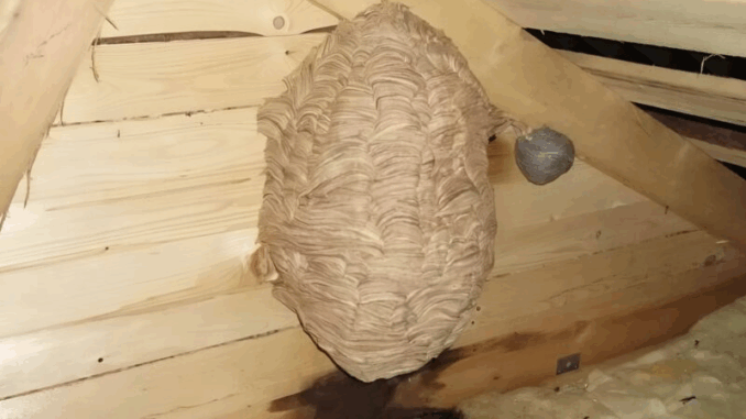 Aujourd’hui, c’est arrivé de nouveau. Mais cette fois, le bruit était plus persistant, plus fort… et plus proche. J’ai pris une lampe torche et je suis monté lentement. Le grenier était étouffant, avec une odeur étrange, douceâtre et désagréable. Soudain, je l’ai vu : au plafond, près du mur, pendait une énorme excroissance gris-jaune, comme faite de papier, avec d’étranges couches circulaires. C’était précisément de là que provenaient les bruits.