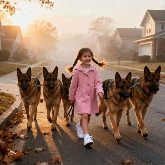 Chaque matin, à sept heures précises, le quartier paisible de Maple Street était le théâtre du même spectacle étrange. Une petite fille, à peine âgée de six ans, déambulait tranquillement sur le trottoir, vêtue de son manteau rose, tenant cinq laisses attachées à d’imposants bergers allemands. Les chiens évoluaient en formation parfaite : un devant, un derrière, et trois de chaque côté, tels des gardes du corps dressés. Aucun adulte ne l’accompagnait. Personne ne savait d’où elle venait ni où elle allait.