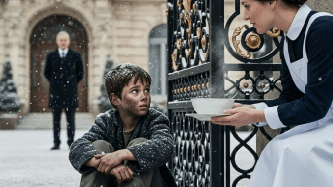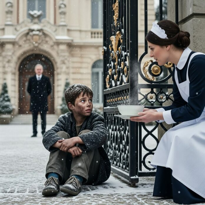 Une servante a nourri en secret un garçon affamé qu’elle avait trouvé devant les grilles du manoir — mais lorsque son patron milliardaire est entré, sa réaction l’a laissée sans voix.