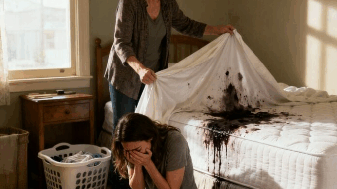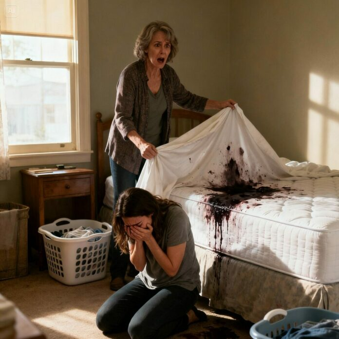 En entrant dans la maison d’hôtes, je me suis figée. Une forte odeur métallique emplissait l’air. Je me suis approchée du lit et j’ai soulevé le drap. Ce que j’ai vu m’a retourné l’estomac : des taches sombres, épaisses et anciennes, profondément imprégnées dans le matelas. Du sang.