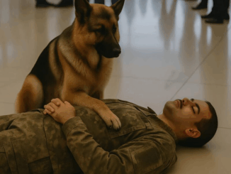 À l’aéroport, des personnes ont remarqué un soldat allongé sur le sol froid, un berger allemand assis à côté de lui, aboyant sur les passants. La foule a été horrifiée en comprenant la raison de l’étrange comportement du chien.